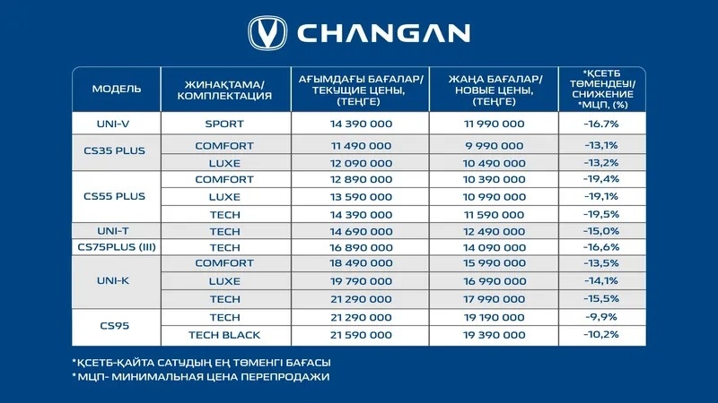 Снижение цен до 19,5%: автомобили Changan теперь производятся в Казахстане